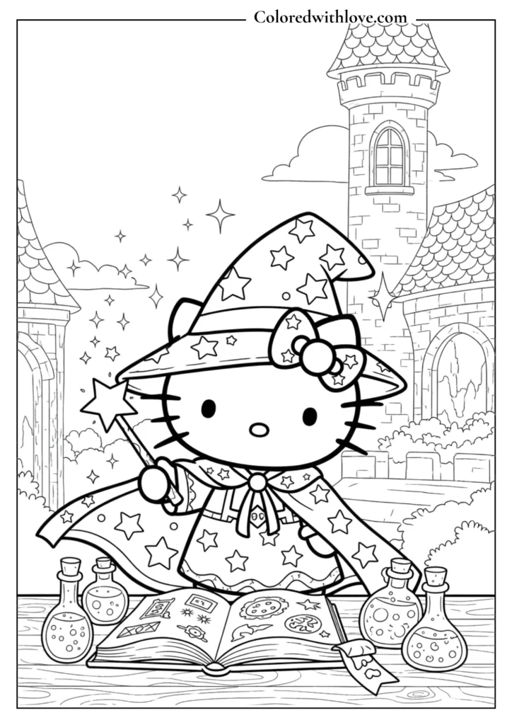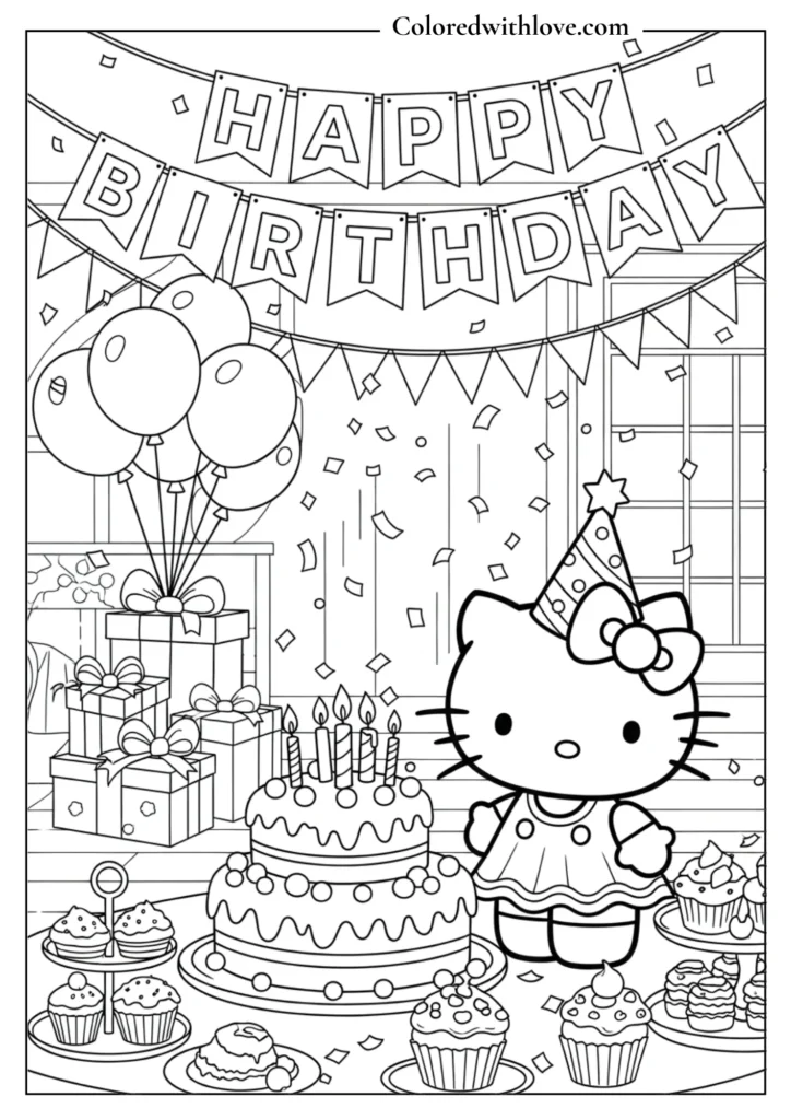 You’ll discover a wide variety of printable Hello Kitty designs in this free collection. From birthday themes and magical adventures to sweet baking scenes and cute everyday outfits, each page offers something unique and fun to color.